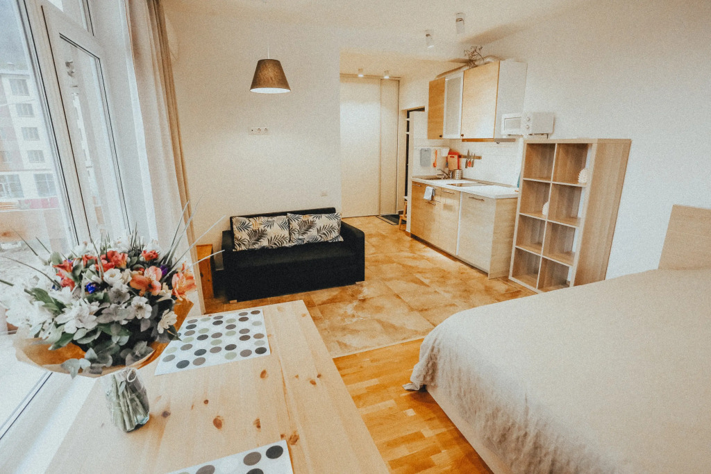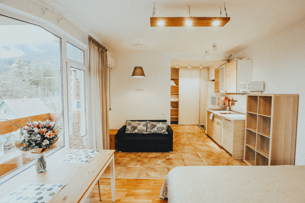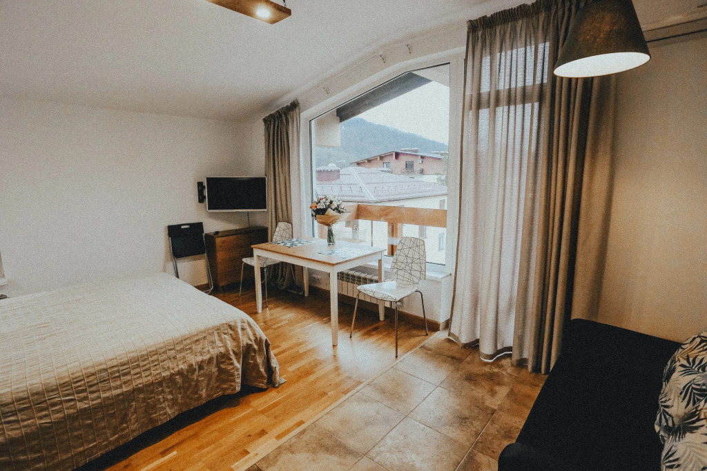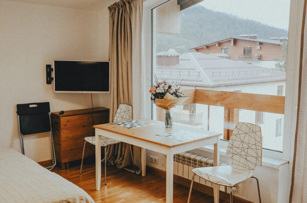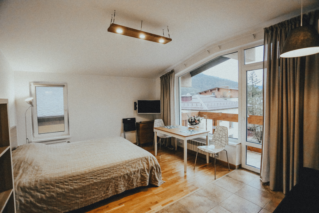 S Vidom Na Gori Apartments 1 are located in the center of Krasnaya Polyana village. There are many restaurants, cafés, a canteen, a bank branch, a grocery store, and the Vertodrom bus stop nearby, where buses from the airport arrive and buses to the resorts depart.