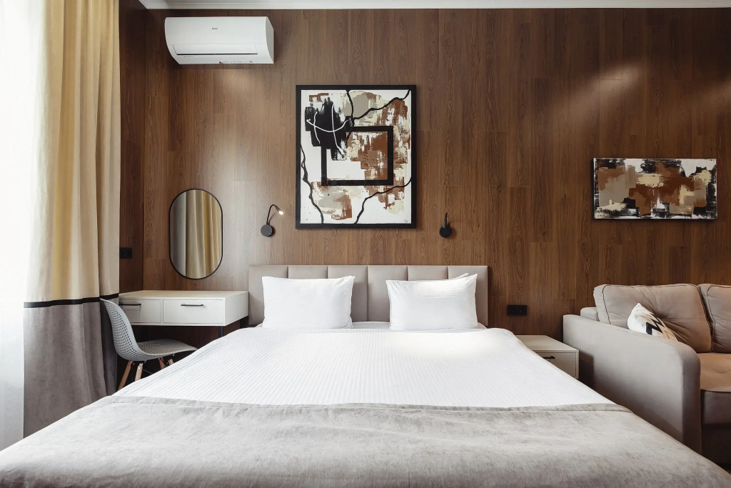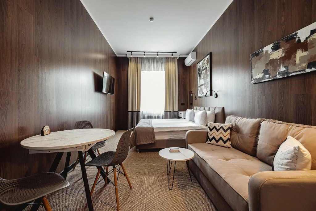 Here’s what you’ll find in the room to have a rest after a long day: a TV and a bathrobe. The room equipment depends on its category.