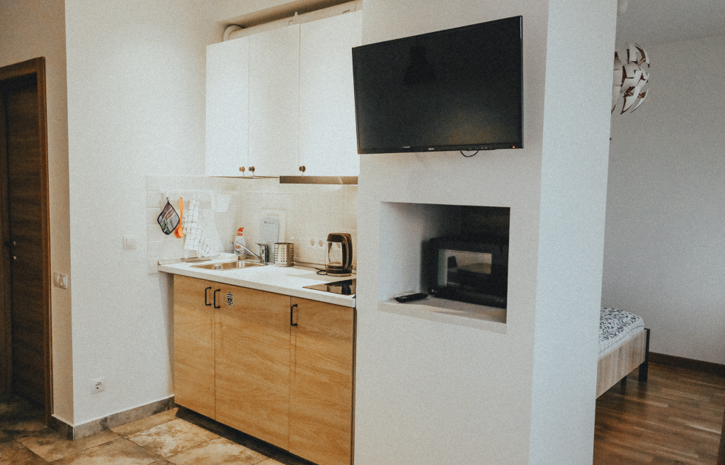 Free Wi-Fi on the territory will help you to stay on-line. If you travel by car, you can park in a parking zone for free. Ski and snowboard fans will enjoy a skiing area and snowboards. At the guests’ disposal, there’s also ironing.