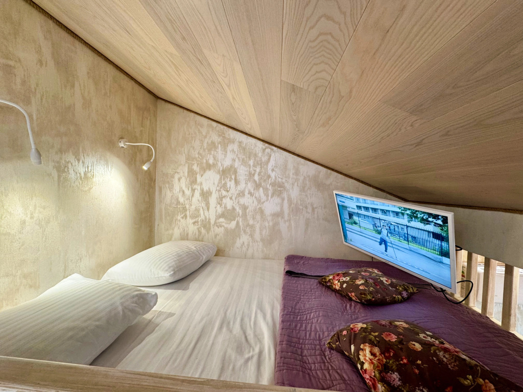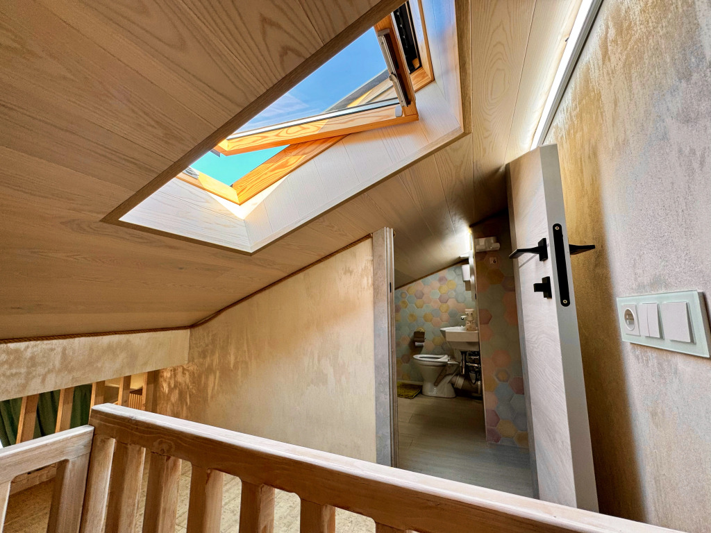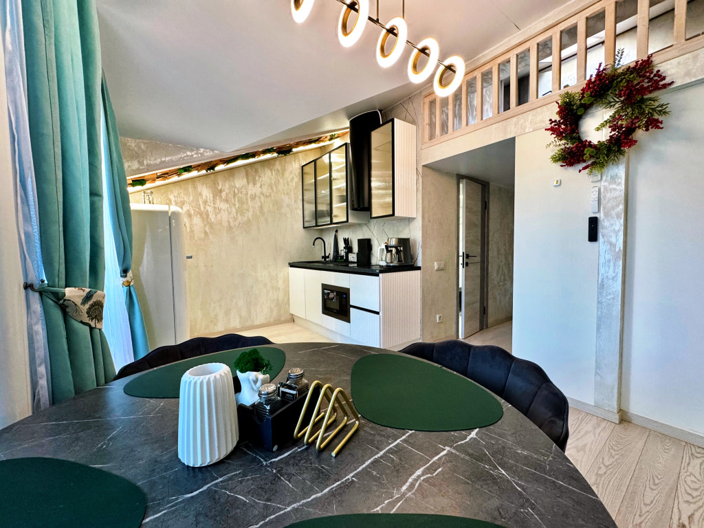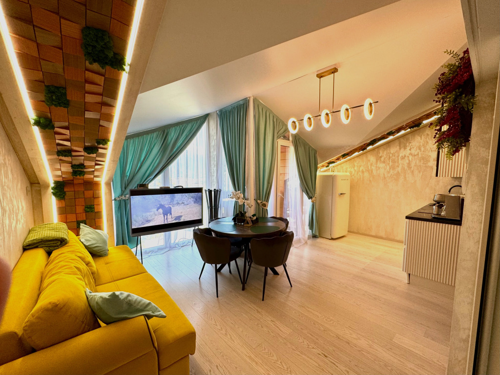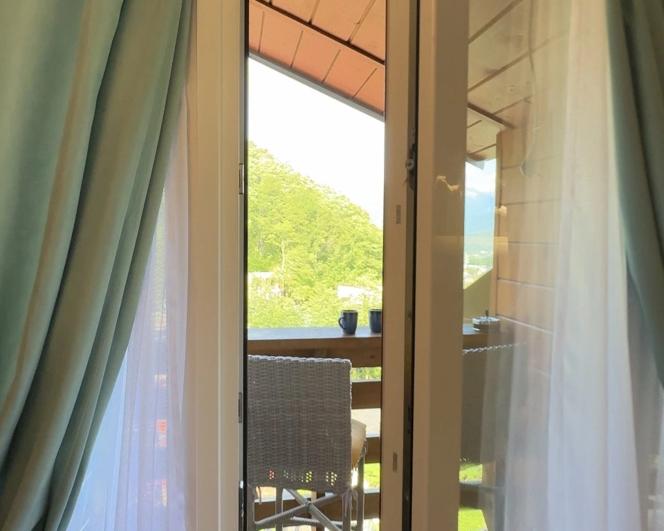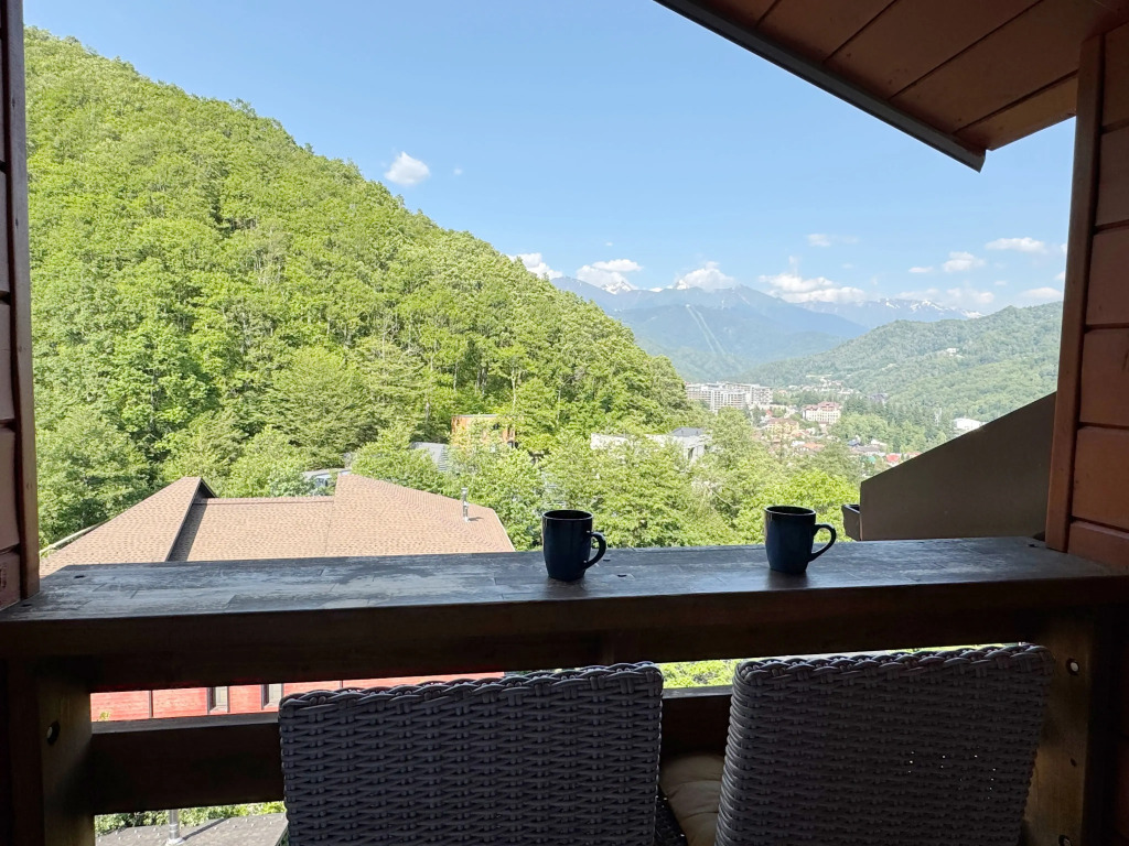 Sleeping accommodations: two double beds with orthopedic mattresses Askona and a sofa bed. Panoramic windows overlook the mountains. There is an open balcony with a bar counter and a heater.