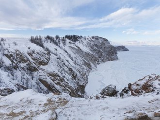 Today we are going to explore the north of the island — Cape Khoboy. Its rocks resemble a sharp fang, and that's how the name translates. We will stop at cape "Three Brothers" — three massifs ending in the water. You will listen to the legend of these rocks, taste the fish soup prepared by our driver, and learn how Baikal "kisses". Let's look into the grottoes with huge icicles, and look at the vertical ice blocks.