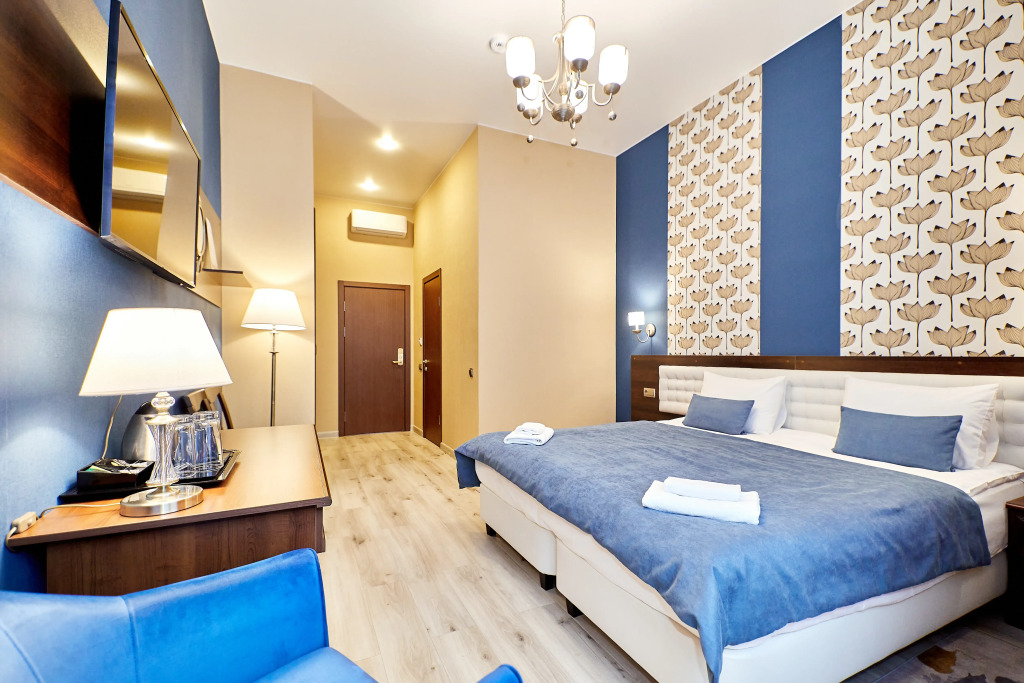 The room is warmly decorated and has everything you need to have a rest after a long eventful day. There is a TV. The room equipment depends on its category.