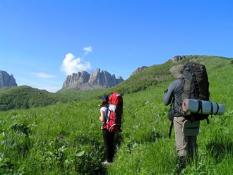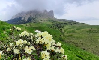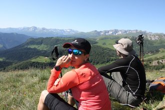 The trail mainly passes through green Alpine meadows, flowering grasses and rhododendrons. In places, the soil can be very wet and therefore good trekking shoes and shoe covers are needed for walking on wet grass (they are also flashlights, gaiters). Climbing the trail along the Agige ridge, we will cross it at a place called "Devil's Gate" and then, admiring the circular panorama of the mountains, from the place "Devil's Window" we will begin our ascent to its highest point - the peak of Acheshbok Vostochny 2440 m.