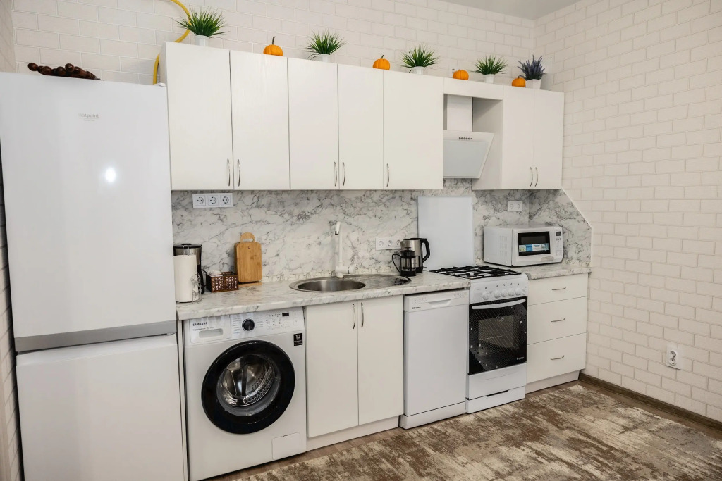 The shared kitchen is equipped with a gas stove, refrigerator, dishwasher, washing machine, microwave, electric kettle, coffee maker, tea, and kitchenware.