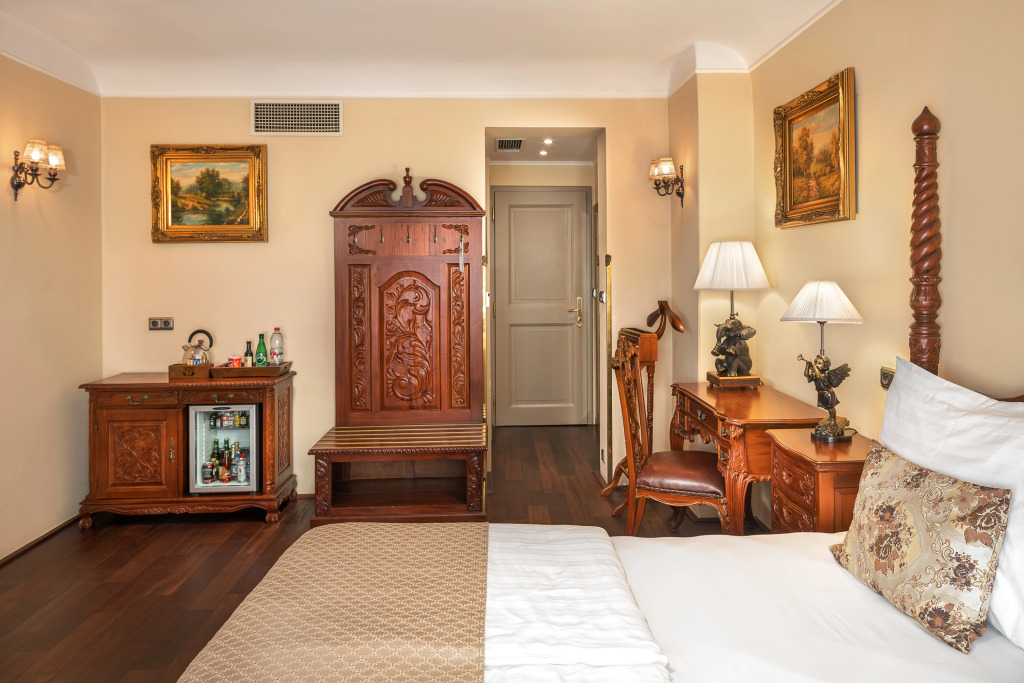 Here’s what you’ll find in the room to have a rest after a long day: a TV, a mini-bar, a bathrobe and slippers. The room equipment depends on its category.