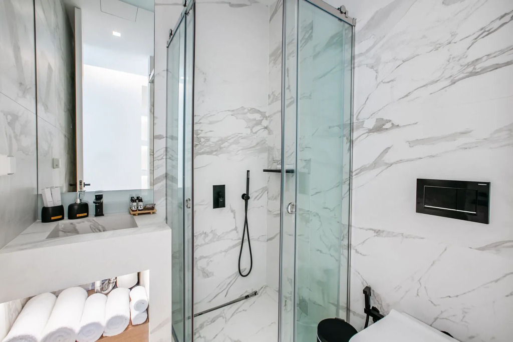 In the room, there is a shower, a TV, a bathrobe and slippers. The room equipment depends on its category.