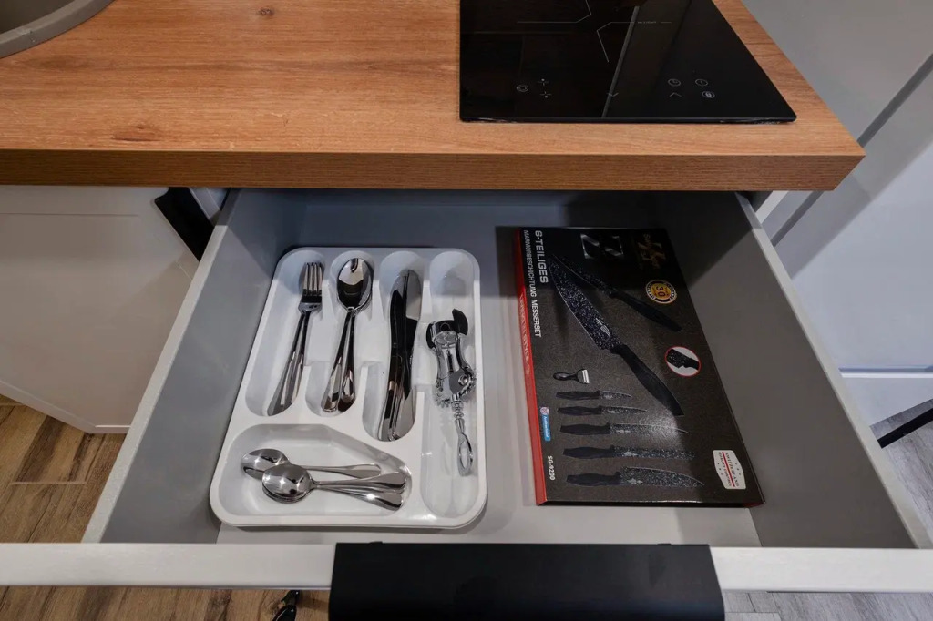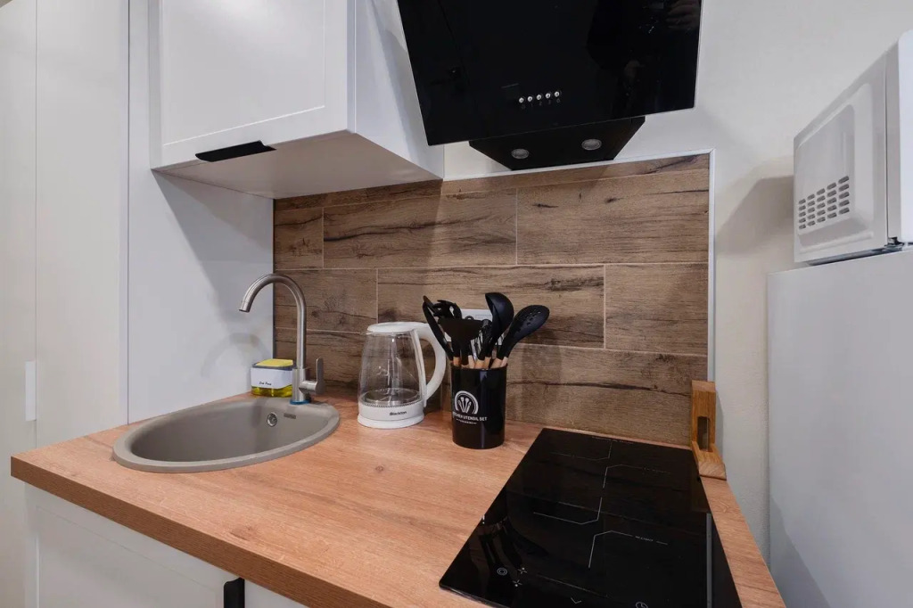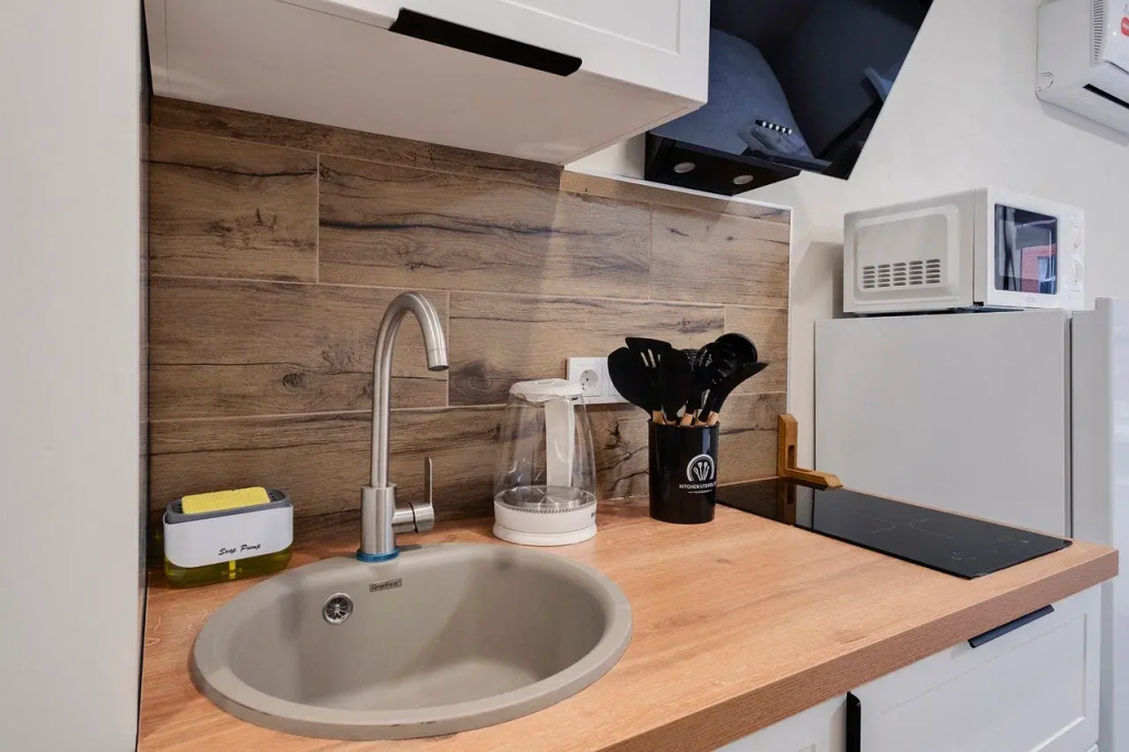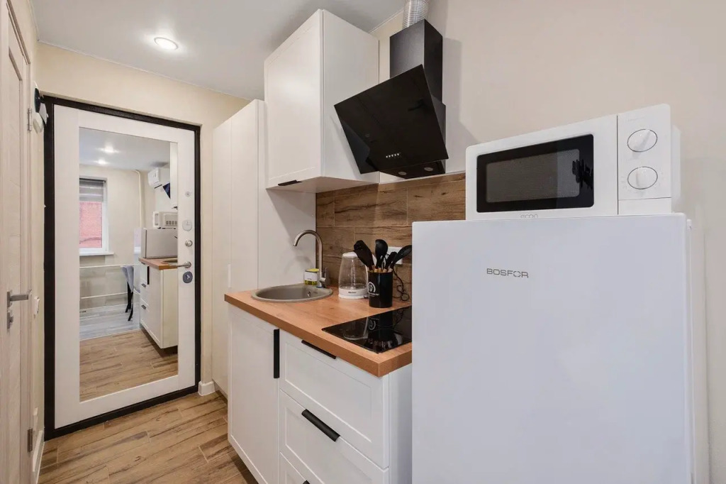 Appliances: air conditioning, washing machine, stove, refrigerator, microwave, electric kettle.