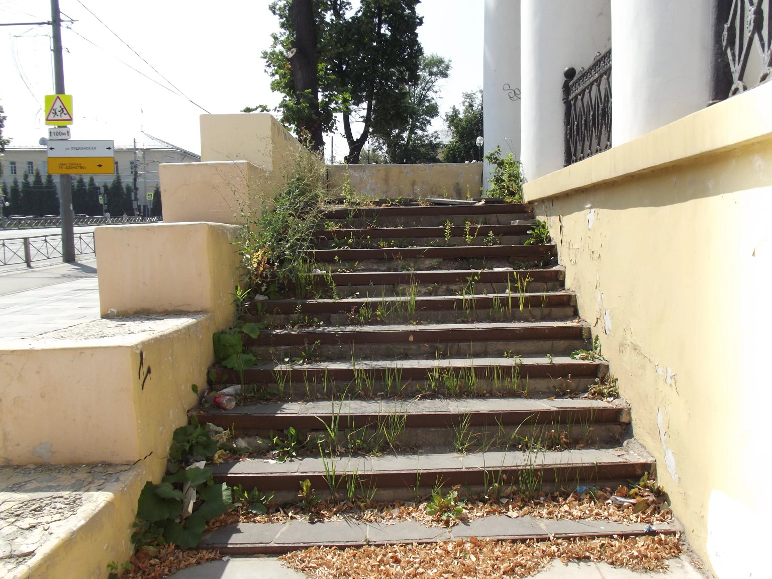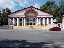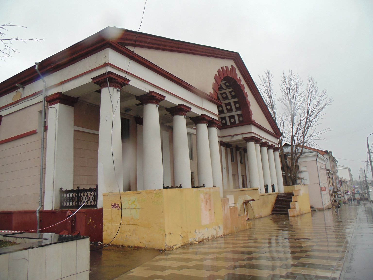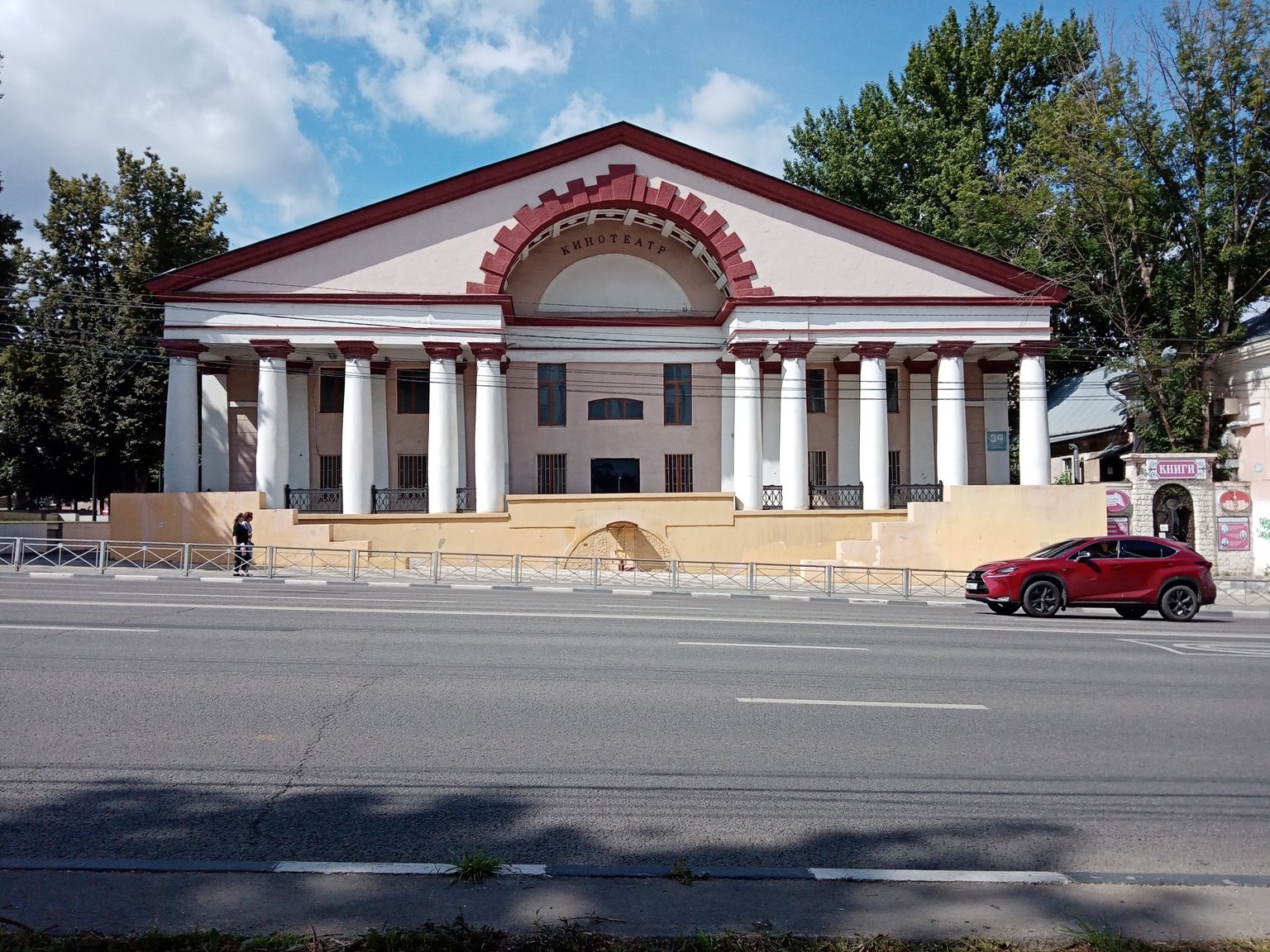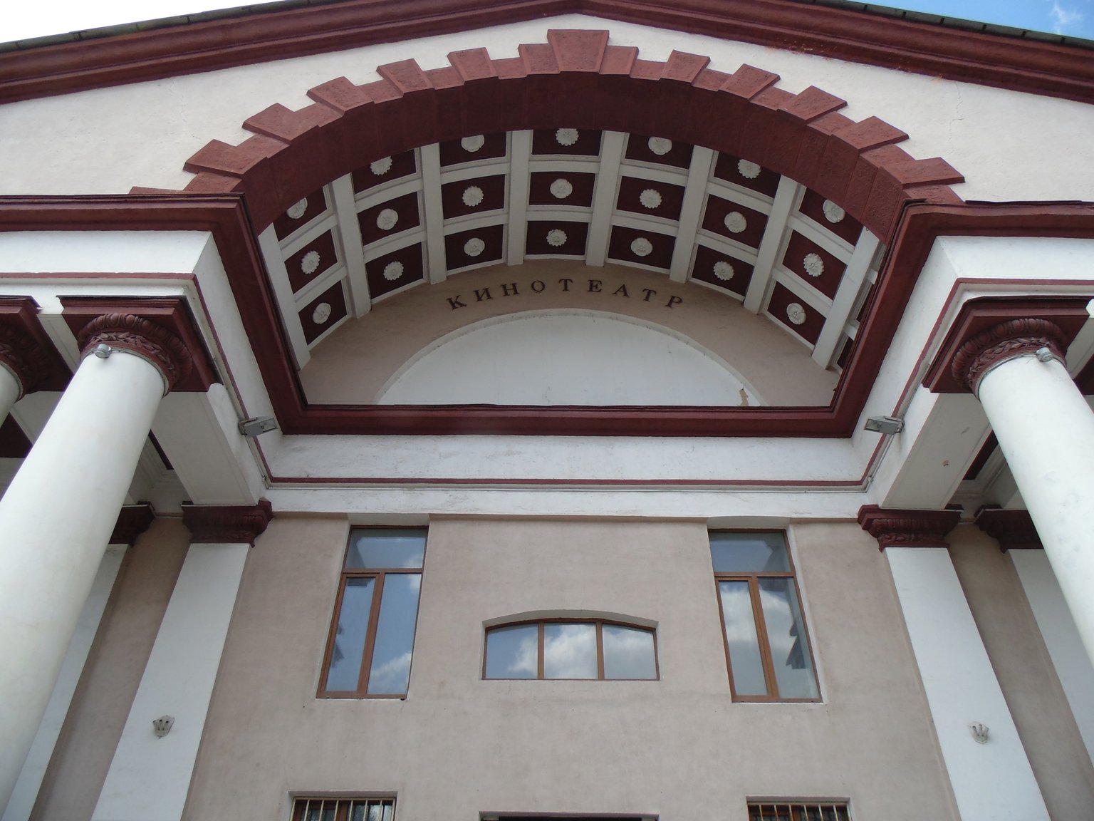 One of the most important buildings in Tula is the Central Cinema. It was built in 1951 with two auditoriums and a lobby. Now the building with the former cinema is not used in any way. The cinema was built in white stone, with cylindrical columns with brackets in a row at the main entrance. The triangular roof with a decorated cornice is rounded from below. A stylized tile is laid out under its base. The windows are fitted with architraves, some of them are covered with a metal grate. Walnut and white colors were used as the main colors during the construction.