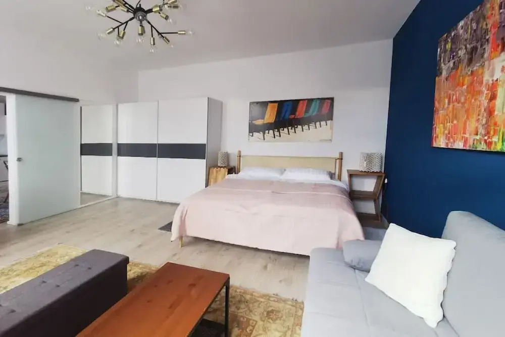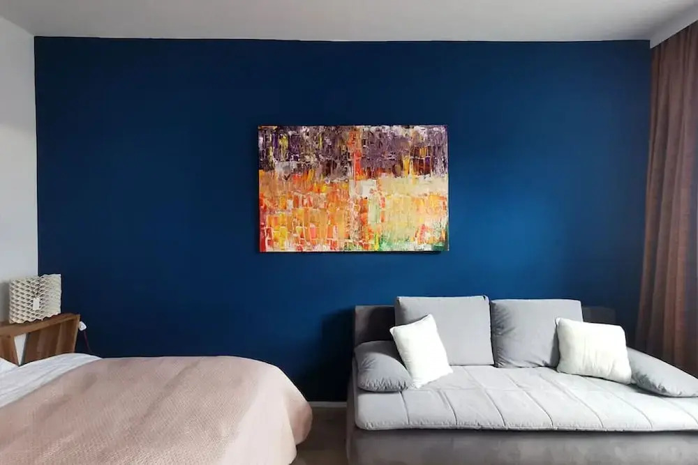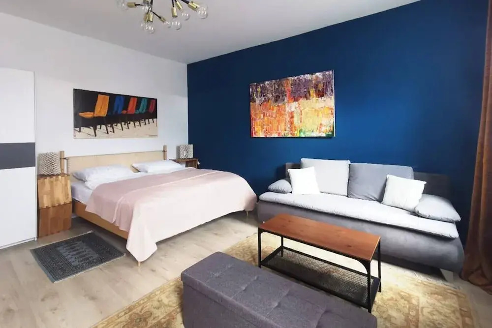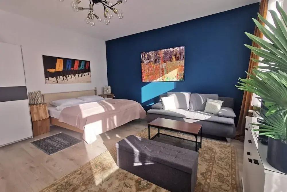 A perfect fit for a big group of travellers: apartment «Blue Palm» is located in Vienna. This apartment is located in 3 km from the city center. You can take a walk and explore the neighbourhood area of the apartment — Westbahnhof, Leopold Museum and Museumsquartier.