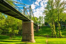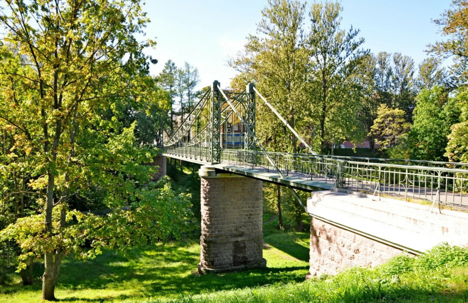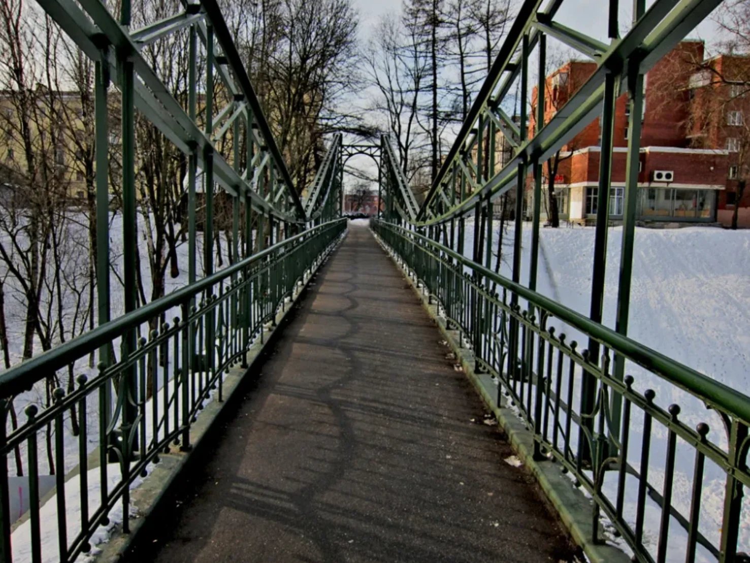 The bridge was built in 1912-1913. It was built in order to shorten the way that Emperor Nicholas II traveled to the temple. The bridge was created by the workers of the Steamship Factory in just three months. The bridge is 91.4 meters long and 2.1 meters wide. It consists of three spans. The bridge is recognized as a monument of history and architecture of the 20th century.