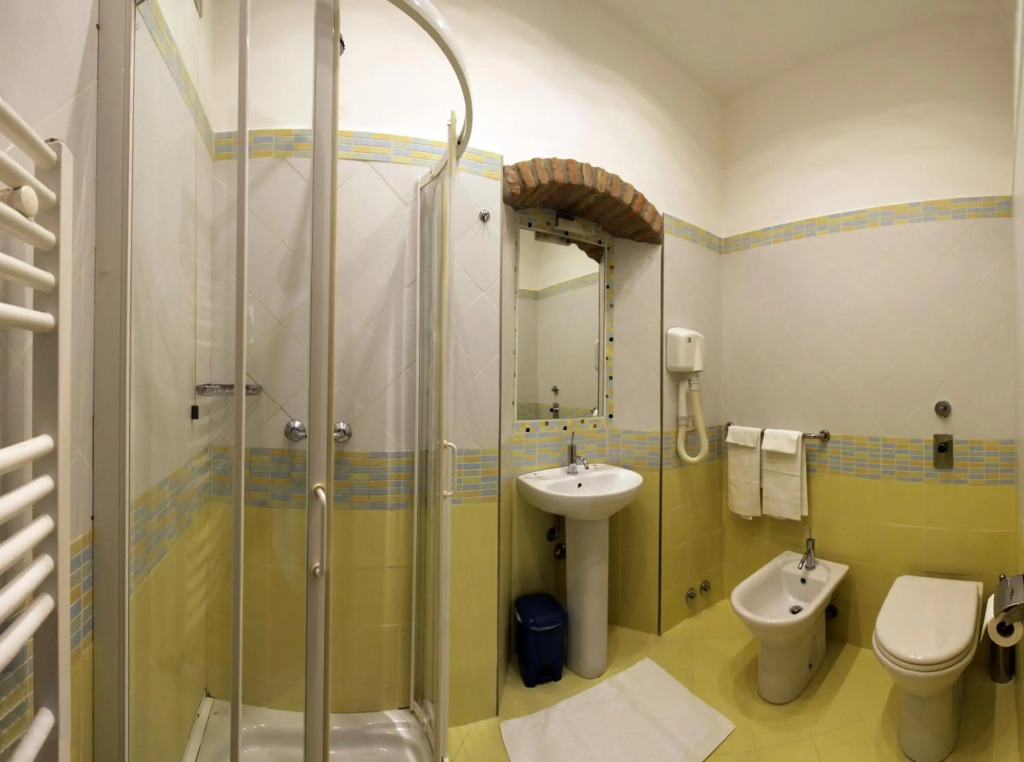 In the room, there is a shower and a TV. The room equipment depends on its category.