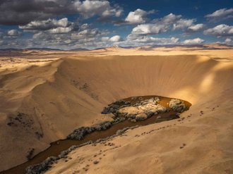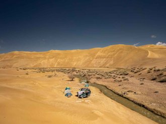 It's been a long and eventful day. Those who wish can get up early and climb the dune in the morning. Departure to the upper reaches of the Mukhartyn Gol river. This place is unusual because the river starts directly from the dune. A big photo shoot on the dunes. Sunset meeting at the viewpoint of a large natural arch at an altitude of 2700m. In the evening we reach the main destination of our trip - Lake Ulaagchiyn Khar Nuur. Campground by the lake at the viewpoint.