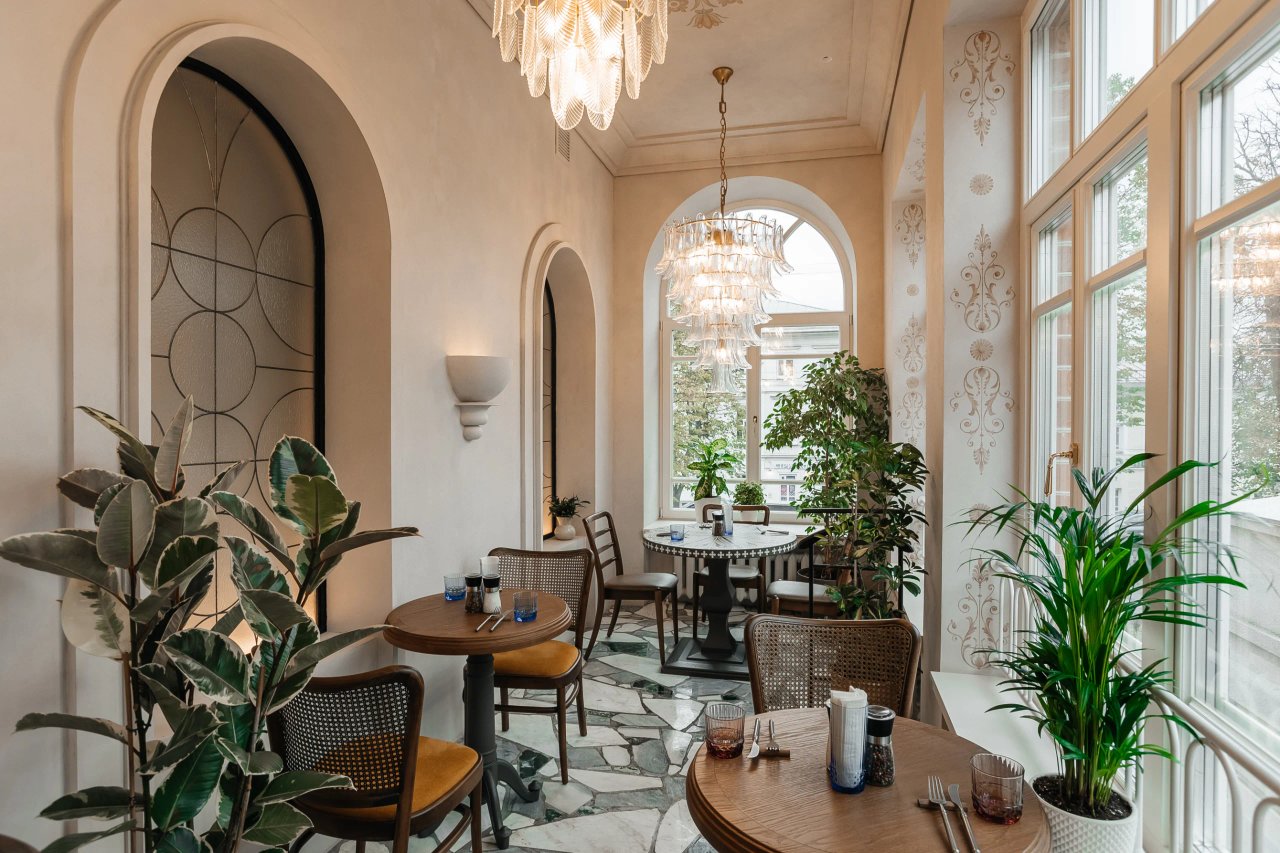 The family restaurant "Syrovar" with antique stained glass windows and a grand staircase is located on two floors at once: on the ground floor there are several tables with children's rooms, with a magic screen and construction kits, and the main communal table for family celebrations, and on the second floor there is a grill area (open kitchen) with a large wood–burning stove and grill. Cheese dishes are baked right in front of the guests, and fragrant meat is made over coals. All the interiors are stylish, dignified, elegant, made with respect for the most historic building.