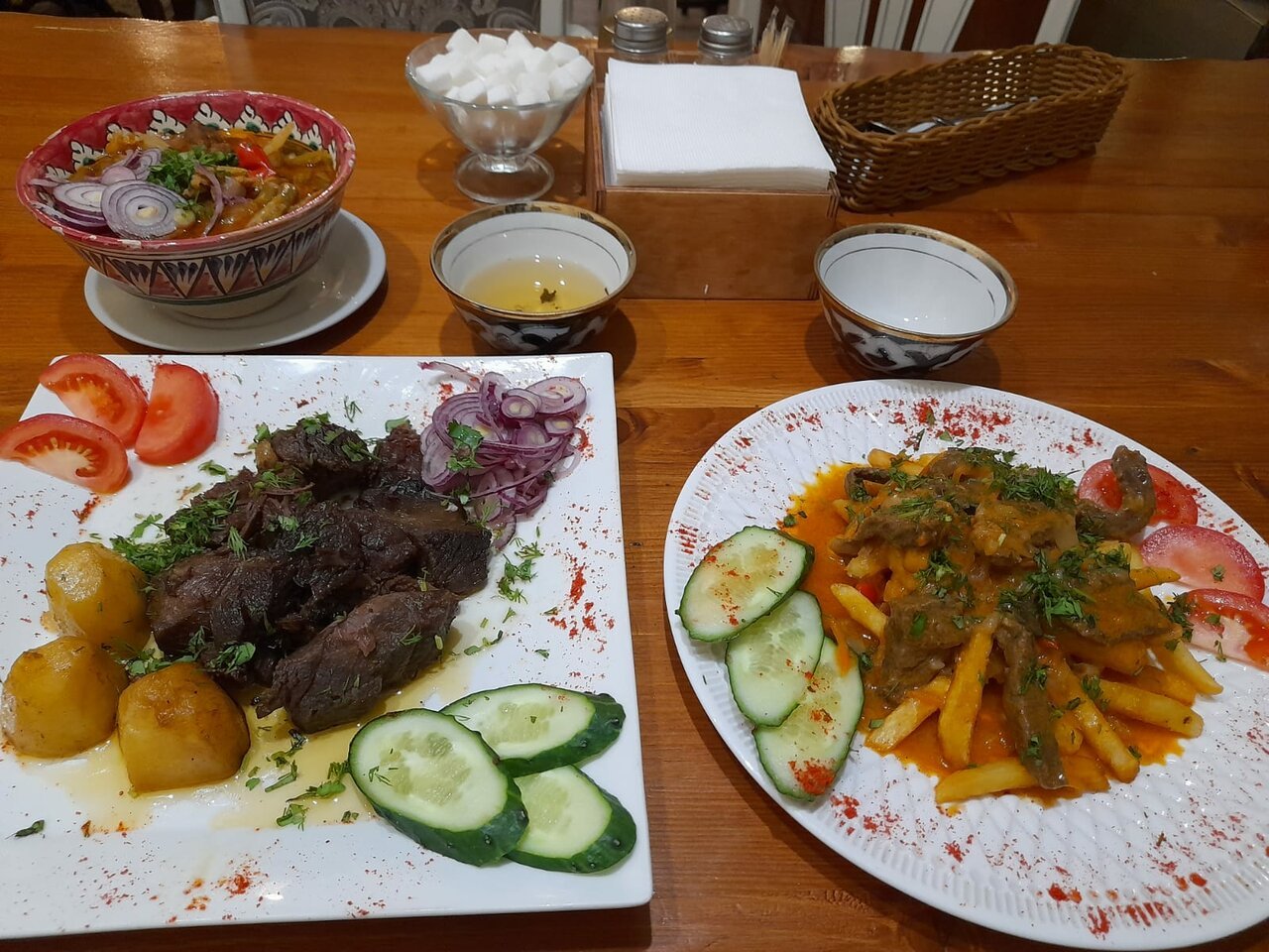 Afrasiab is an Uzbek cuisine cafe. This establishment is located near the San Galli Garden. The menu offers a variety of dishes. For example, honum, fried lagman, manti, veche salad, lamb shurpa, chuchvara, honey cake dessert, baklava and much more. There is also a large selection of cold and hot drinks. Tea, coffee, lemonade. Sometimes you can watch sports broadcasts here. And at certain hours you can get to a business lunch.