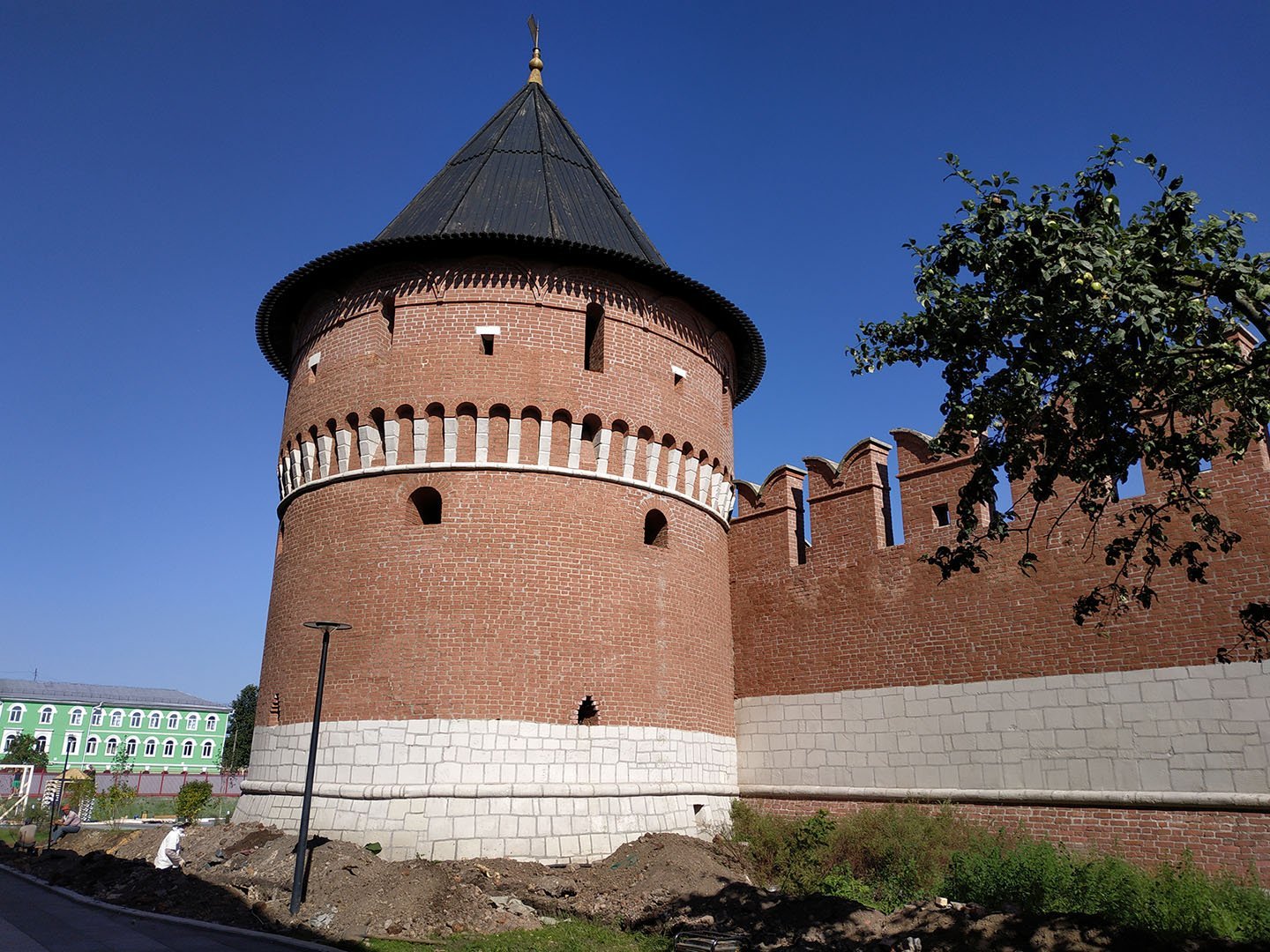 The rectangular Tower is part of the Tula Kremlin, built between 1514 and 1520.The round-shaped tower is located on the north side of the Kremlin. It is located near the Upe River, so it is called Angled to the river. Its second name is Ugolnaya opposite Myasny Ryad or Myasnitskaya. Previously, there were commercial butcher shops near the tower. Previously, the tower housed a commercial warehouse.