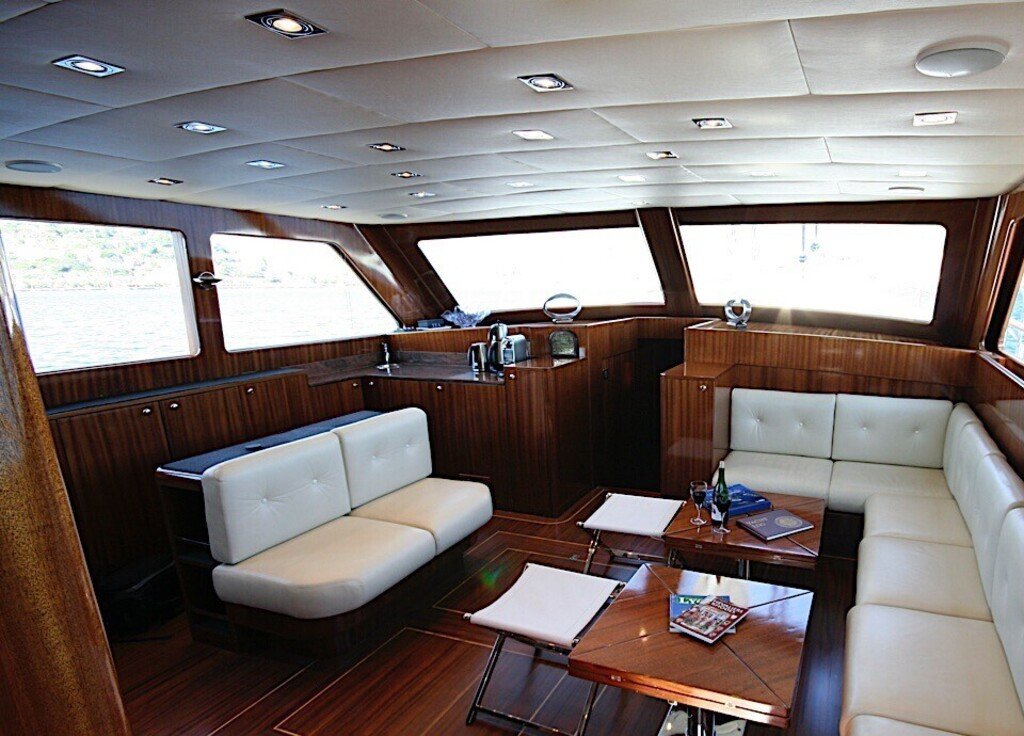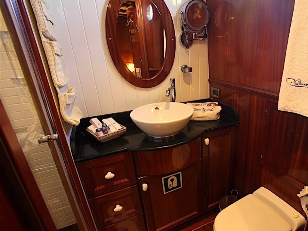 Gulet is a fairly large yacht, at least 10-12 meters in length, with an average of 20-30 meters. Thanks to the thoughtful design, guests have a spacious deck with relaxation areas, a lounge, and each guest cabin is usually equipped with air conditioning, a shower cabin and a toilet, more like a hotel room.