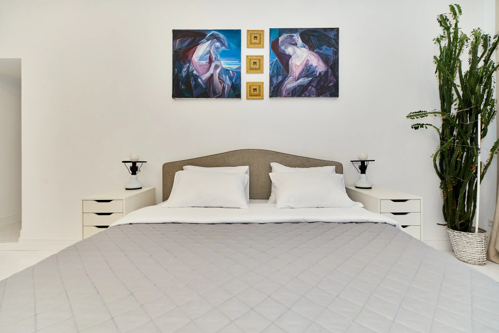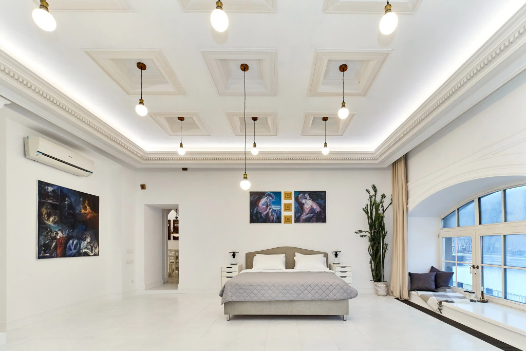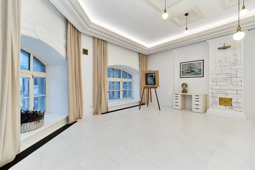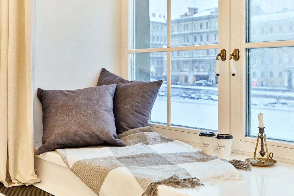 The apartment is a 100 sq. m. apartment with panoramic views and a kitchen. Each room offers a direct view of the Fontanka River. One room features a decorative fireplace. This accommodation is ideal for exploring the city for a couple, family, or small group. The apartment has two double beds and can accommodate up to five people.