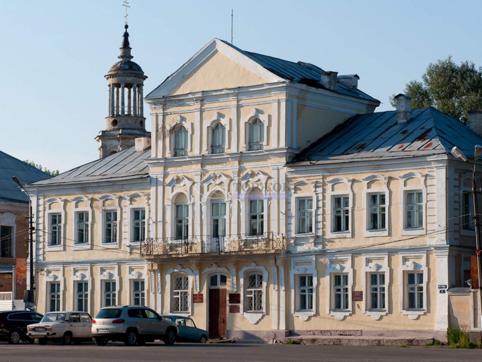 In the 68th year of the 18th century, the magistrate's building was erected. It was originally built as the main house of the Kutafiev estate. In the 18th century, the merchant went bankrupt, and the house was bought at the expense of the city treasury. Subsequently, a mezzanine was added and the building was redeveloped. The new premises housed various city institutions. It is a two-storey building with a mezzanine, brick and plastered, was built in the shape of a rectangle. The central part of the main southern facade is highlighted by a small risalite. There was a balcony on the second floor. On the northern facade, the house has a large ledge in the center - there is a staircase leading to the second floor and the mezzanine. Currently, the Administration of the Torzhok district is located here.