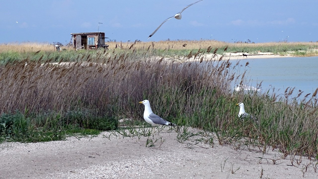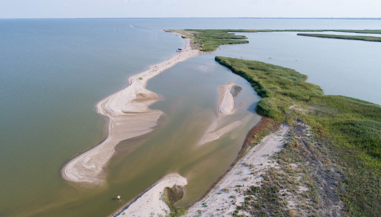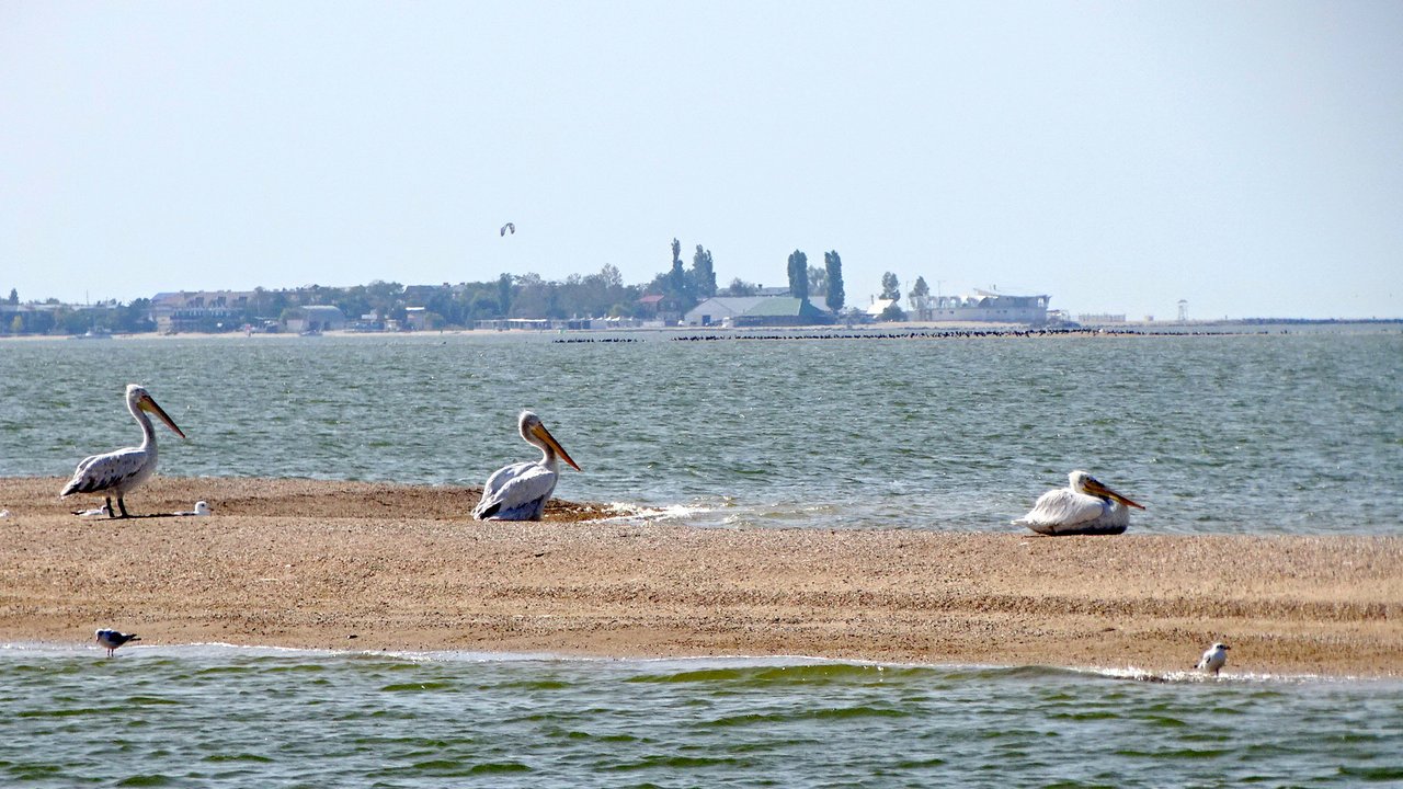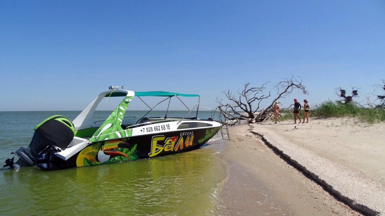 Our boat makes trips to the island of Yeiskaya Spit. He is also Bird Island, Island of the Seven Winds, Green Island, Turtle Island...