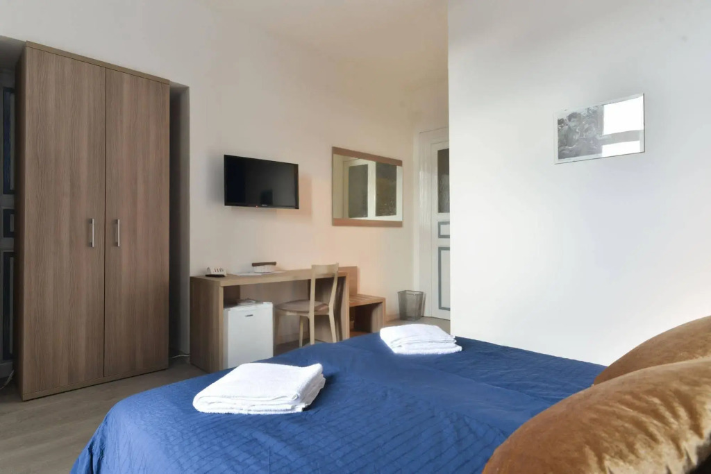 The room is warmly decorated and has everything you need to have a rest after a long eventful day. There is an alarm clock, a shower and a TV. The room equipment depends on its category.