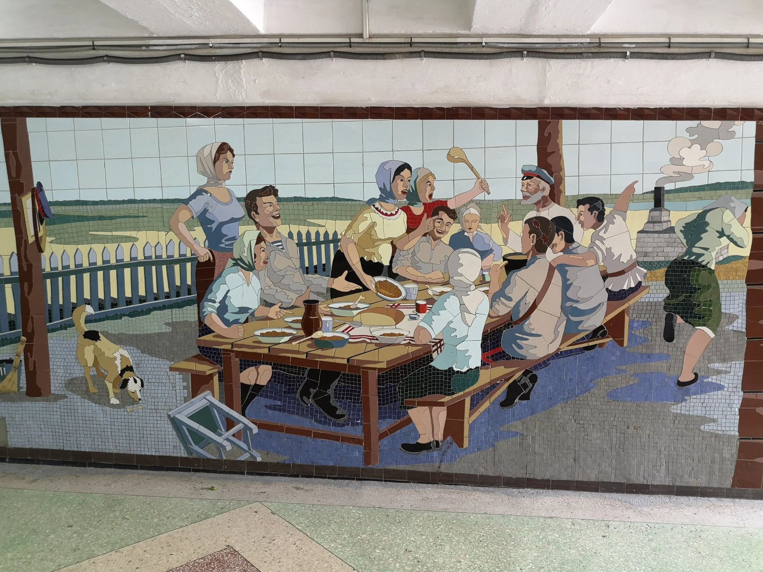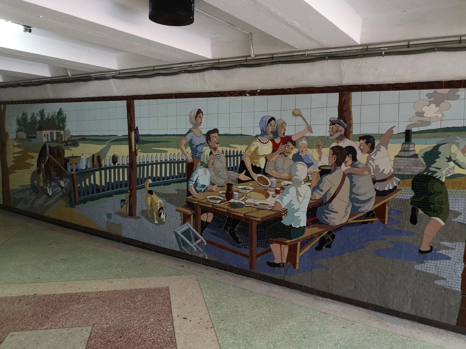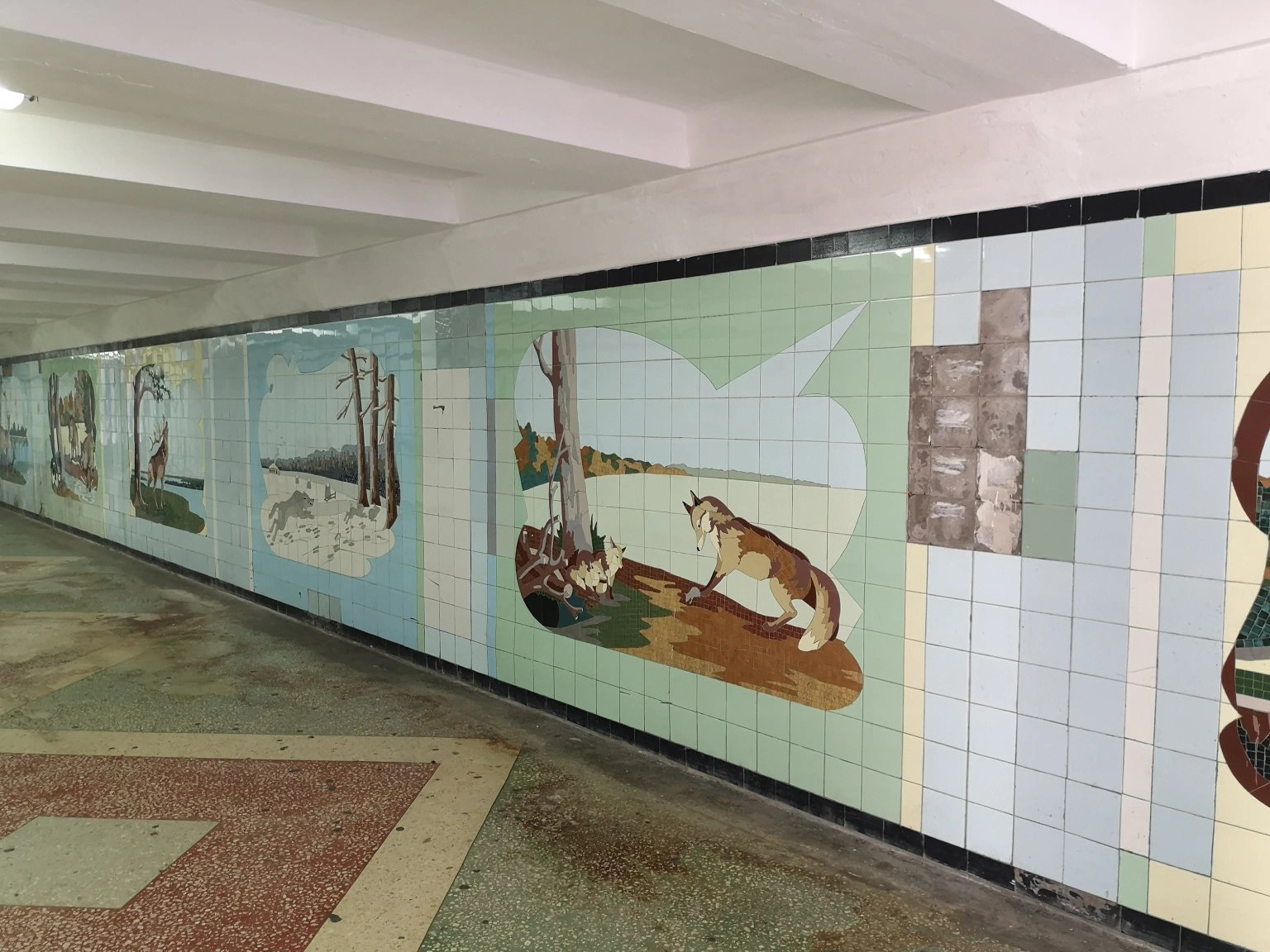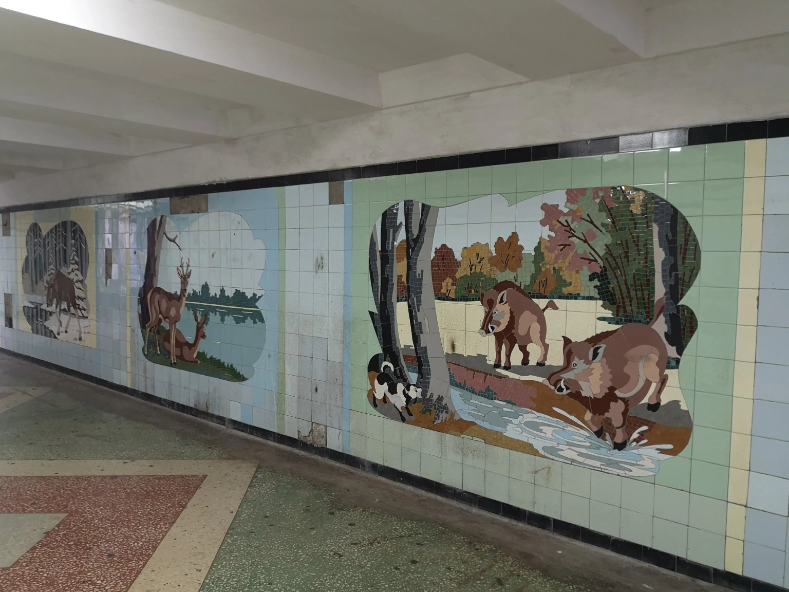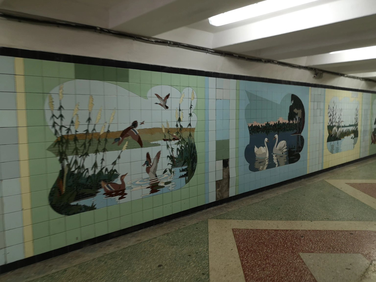 Underground pedestrian crossing with themed mosaic panels