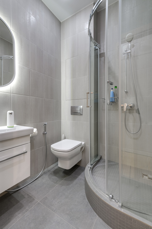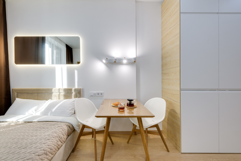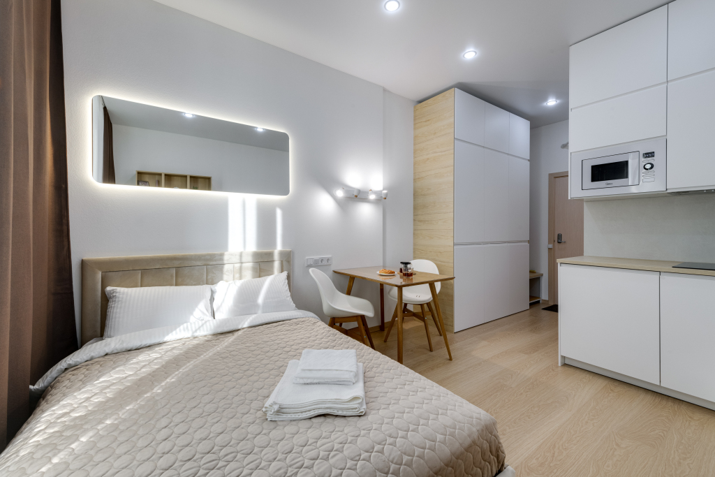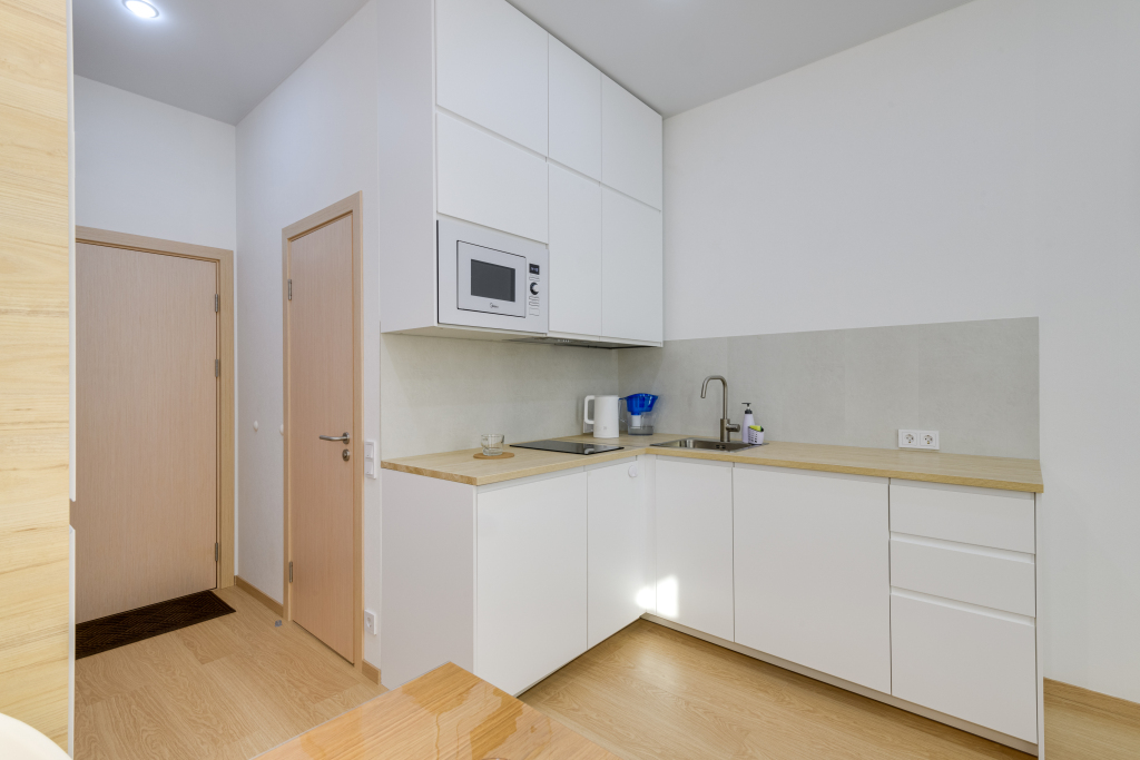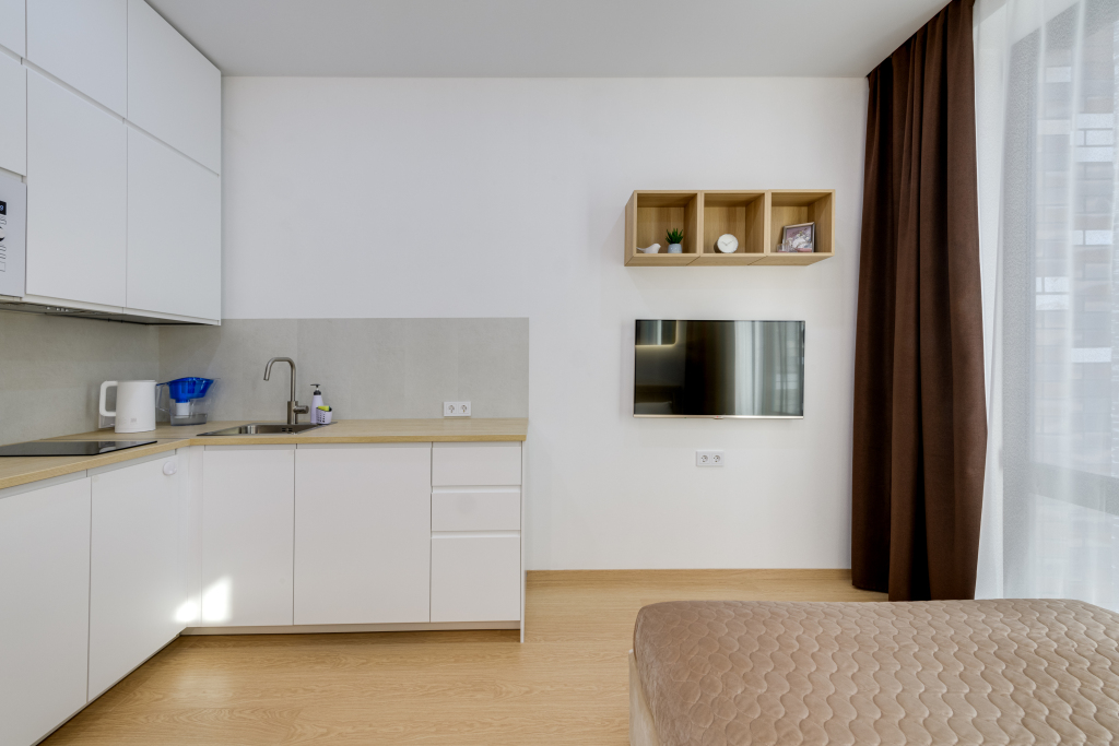 The 23 sq.m apartment is equipped with a double bed with an orthopedic mattress, a wide-screen TV, Smart TV with more than 100 channels, high-speed wireless Internet, a washing machine, an ironing board, an iron and a hair dryer, a kitchen area equipped with utensils, and built-in appliances ( refrigerator with freezer, microwave, stove), as well as floor-to-ceiling panoramic windows.