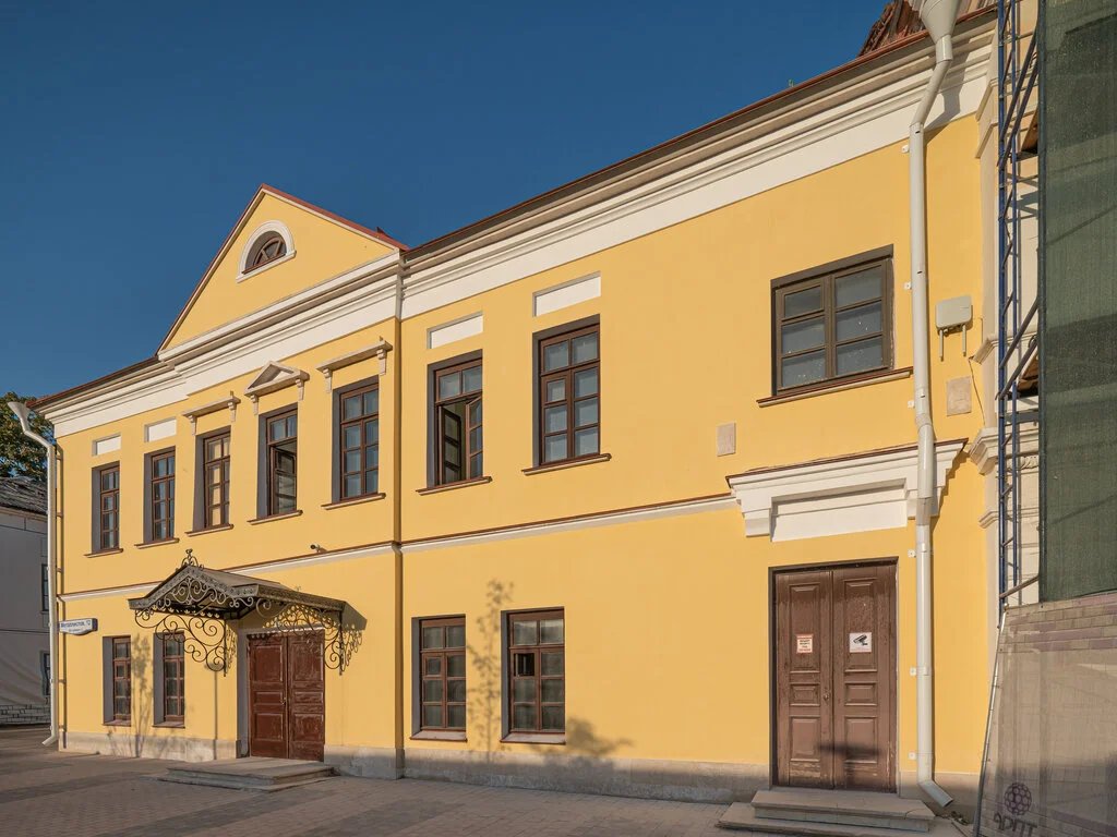 The Sisin House, built in the late XVIII — early XIX centuries in the city of Tula, is an architectural monument. There were shops on the ground floor and an apartment building on the second floor. The facade was restored in 2014. There is a small monument to Tula craftsmen next to the house. There are columns on the second floor of the building, and the facade of the house is decorated with decorative elements. There is a twisted canopy above the entrance.