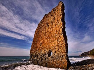 It is a flat rock thirty meters high and twenty meters wide, resembling a sail. One end of it is washed by the sea, and the other rests against the shore. The appearance of such an unusual "sail" is explained by the action of surf and winds. Even more mysterious is the appearance of a hole in the lower part of the Sail Rock. The official version of the hole's formation is the footprint of a cannonball that appeared in the middle of the 19th century. Mysterious, isn't it…