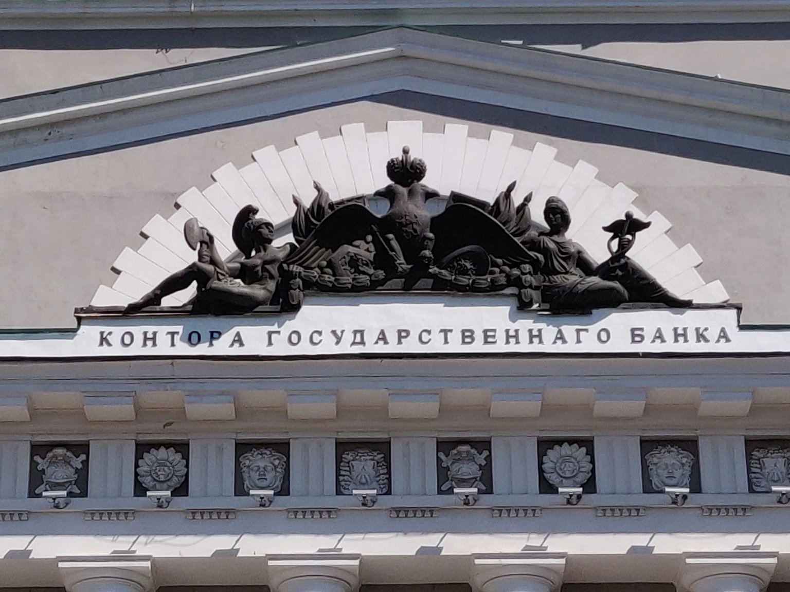 The building was built in 1913-1914 by architect M.M. Peretyatkovich to house the office of the Central Bank of the Russian Empire. The State Bank building faced the New Market Square and faced the altar of the Alexander Cathedral. In the 1920s, the south-eastern wing was completed according to Peretyatkovich's project, where the apartments of the employees were located. The office building became the only surviving building of the square after the Great Patriotic War. During the restoration, the facades of some buildings were built in a similar style.