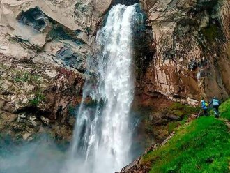 Along the Kyzylkol River, we come to the all-round Irahisyrt plateau, picturesquely complementing the ice caps of Elbrus with colors. After crossing the plateau, we will get to an amazing place: the Sultan waterfall, plunging its waters, rumbling from a height of almost 40 meters, and a little further from it the thermal mineral waters of Jila – Su, in which you can take baths and swim
