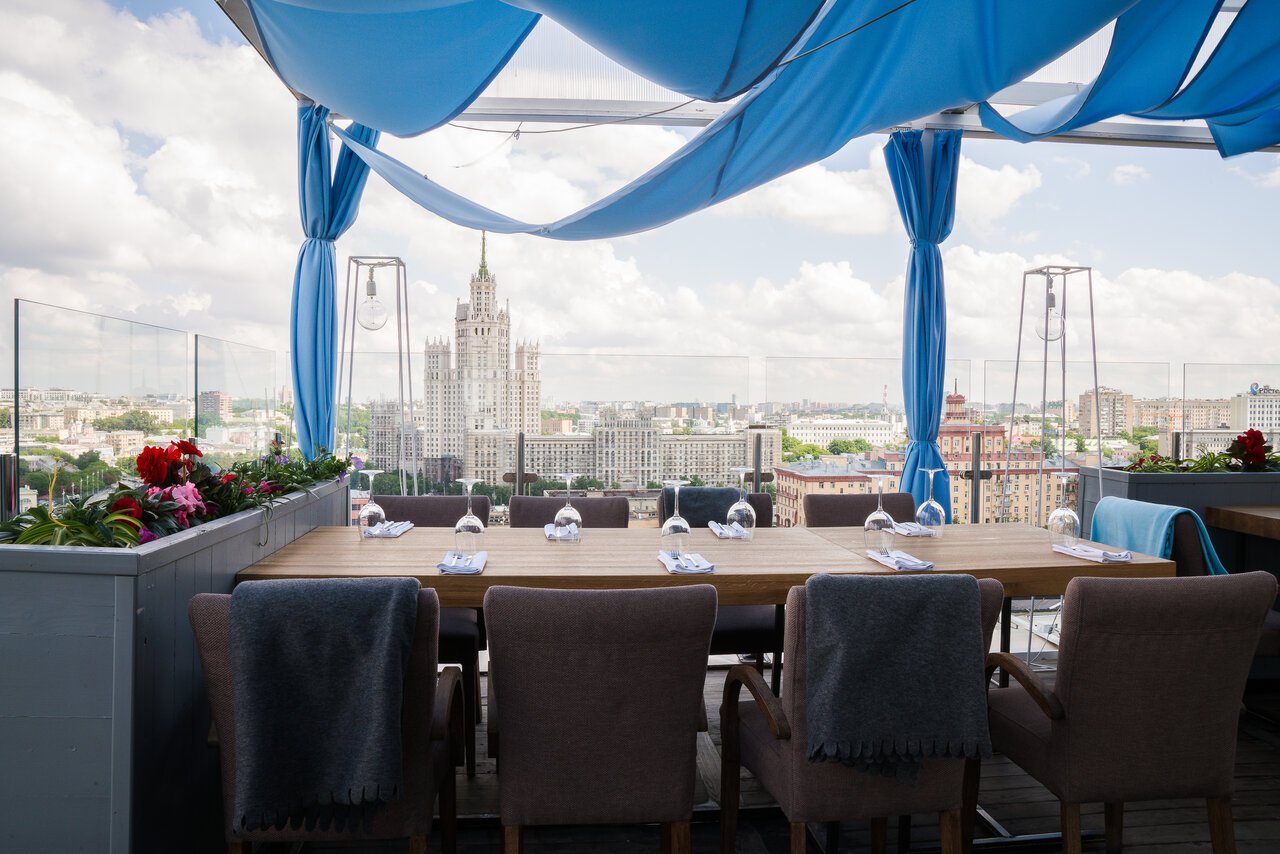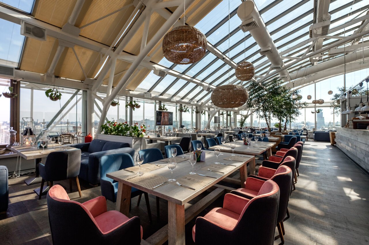 * The restaurant is located on the roof of the Central City Tower business Center. It offers panoramic views of the Kremlin. The restaurant's cuisine is led by brand chef Carlo Grecu. The menu focuses on local products: Russian marbled beef, fish and farm poultry. There is a Raw Bar, an ice showcase featuring various types of shrimp, oysters, Kamchatka crab and other delicacies. There are activities for children: children's creative workshops, cooking classes, performances and fun games.