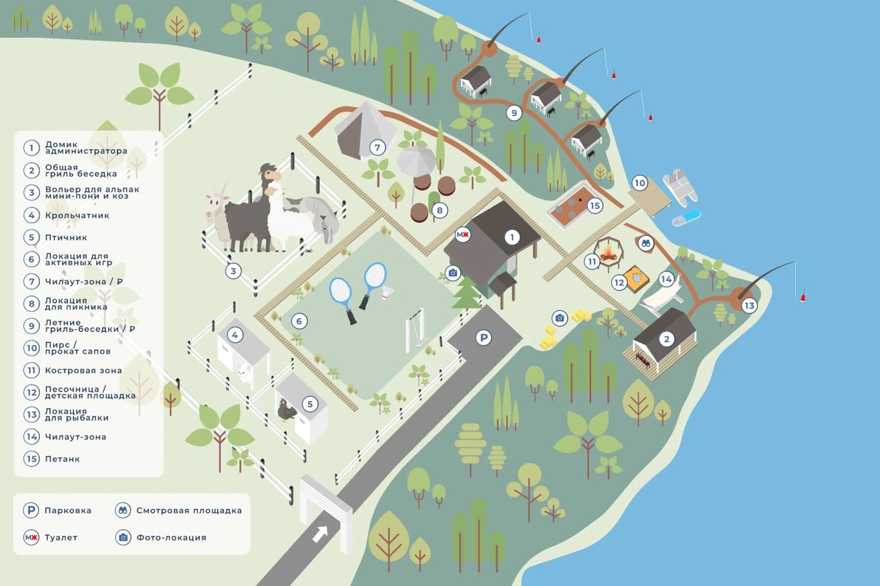 And what could be better than relaxing in the fresh air with delicious food and a fishing rod in your hands? In PARA ALPACAS, fishing locations have been created in the lake (you don't need to bring fishing rods with you), where you can just stand and be silent, enjoy the peace and quiet. Caught fish can be cooked on a barbecue, which is installed near a large barbecue gazebo and immediately eat fresh prey.
