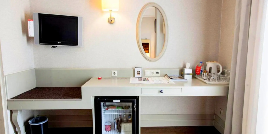 Here’s what you’ll find in the room to have a rest after a long day: a TV and a mini-bar. The room equipment depends on its category.