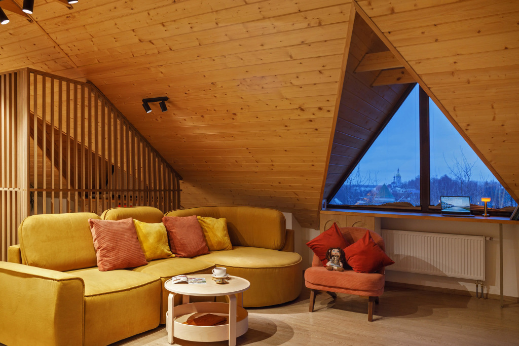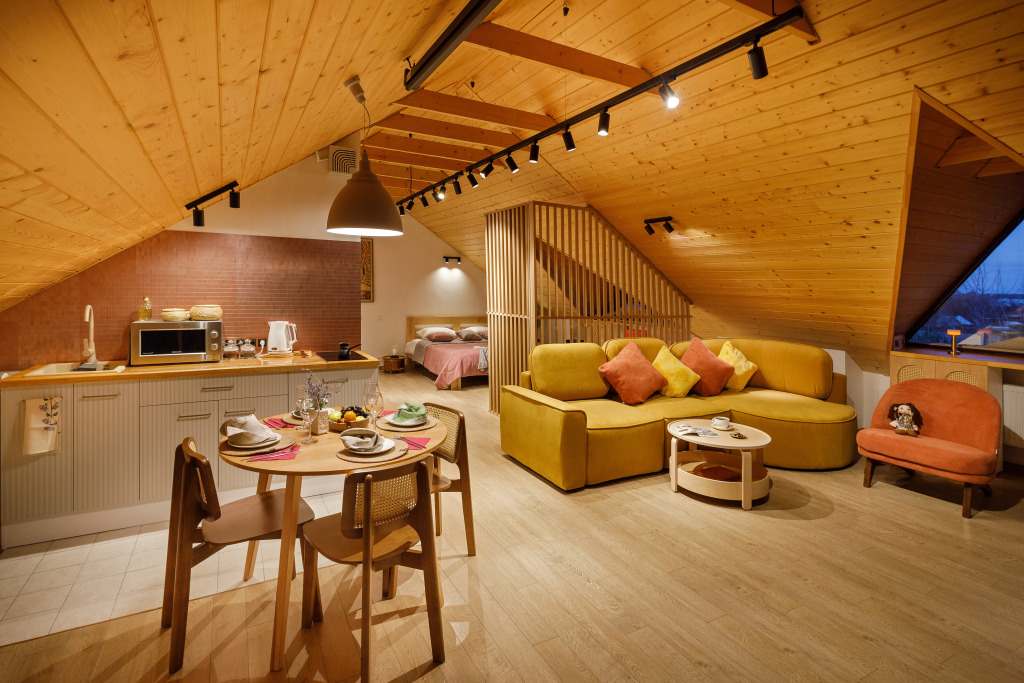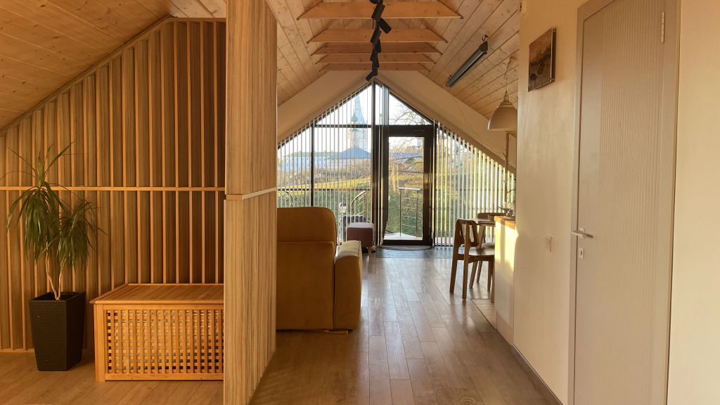 The attic is a separate room with its own entrance, accommodates from 1 to 4 people. It is a fully soundproofed space of 65 sq. m.