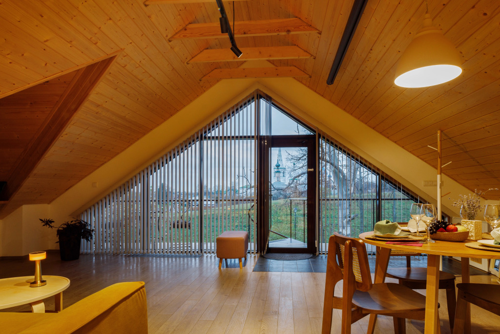 Mansarda Oko Flat is located in Suzdal. The house is located by the Kamenka River, surrounded by ancient earthen ramparts with a panoramic attic.