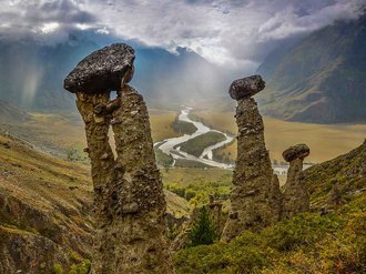 Seminsky 1717 m above sea level, Chike Taman pass 1295 m above sea level, Ulagansky pass height 2080m. above the sea level is the Katu - Yaryk pass with its fantastic serpentine, which descends 3.5 km with an altitude difference of 500 meters, and observation decks with amazing views. places of power: Kur - Ketchu, Katun terraces, the confluence of the Katun - Chuya rivers, Geyser Lake. Cholushmanskaya valley with many beautiful waterfalls and majestic mountain and rocky massifs, stone mushrooms and the lake surface of Teletskoye.