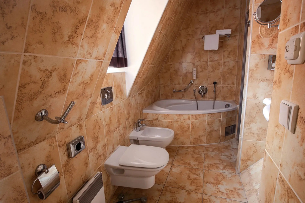 The room is warmly decorated and has everything you need to have a rest after a long eventful day. There is a shower, a TV, a mini-bar, a bathrobe and slippers. Please note that the listed services may not be available in all the rooms.